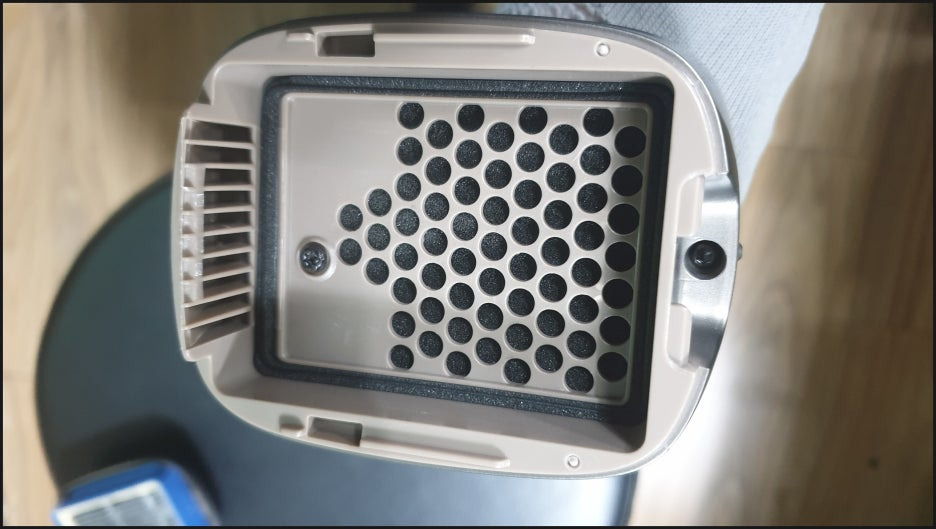 배터리 부분 하단의 덮게를 손으로 제쳐 빼면 필터가 보이고, 반대편으로 나사 체결된 부분이 보입니다.